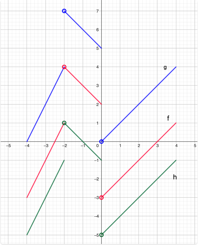 Aby narysować wykres funkcji g, przesuń wykres funkcji f o 3 jednostki w górę oraz aby narysować wykres funkcji h, przesuń wykres funkcji h o 2 jednostki w dół. Następnie zauważ, że funkcje g i h nie przyjmują największej wartości. Później odczytaj najmniejsze wartości funkcji g i h.