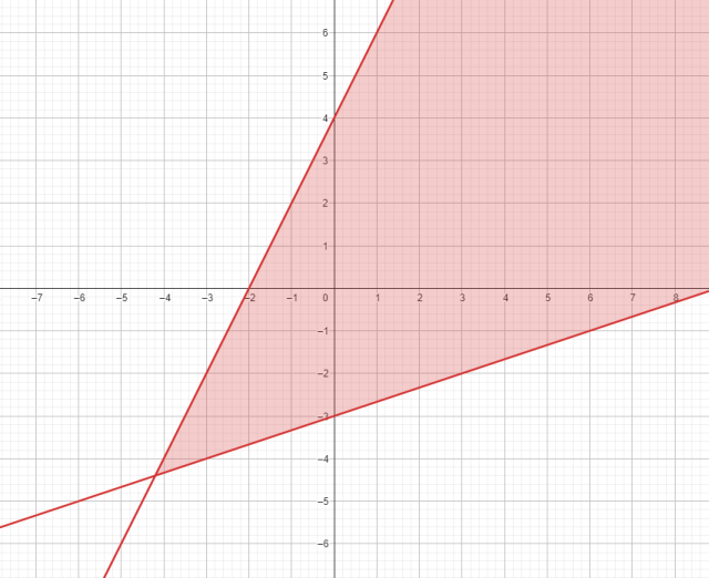 Jeżeli część wspólna z drugą nierówność ma być kątem to druga nierówność musi być tworzona przez prostą przecinającą się z prostą podaną w zadaniu. Przykładowa nierówność