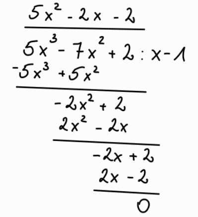 Przekształcasz dane równanie, aby otrzymać wielomian. Zgodnie z twierdzeniem o pierwiastkach całkowitych wielomianu sprawdzasz, które liczby są jego pierwiastkami. Po ustaleniu danej liczby wykonujesz dzielenie pisemne wielomianu. Wynikiem dzielenia jest trójmian kwadratowy, który sprowadzasz do najprostszej postaci korzystając z delty, co umożliwi ustalenie wszystkich pierwiastków wielomianu.