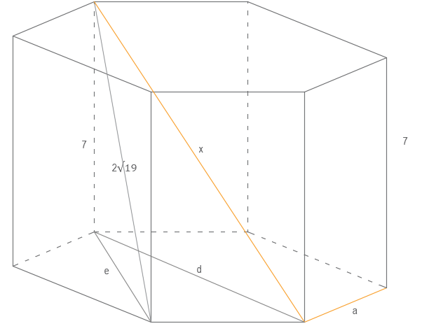 Dany jest graniastosłup prawidłowy sześciokątny. Jego wysokość wynosi 7, a krótsza przekątna