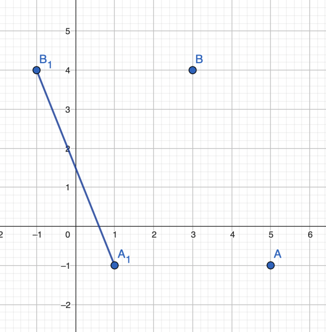 Na początku zaznacz na wykresie punkty A i B, a następnie przesuń je o 5 jednostek w prawo i jedną jednostkę w dół, aby otrzymać punkty i Połącz odcinkiem punkty i