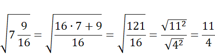 Zamień liczbę pod pierwiastkiem na ułamek niewłaściwy,skorzystaj z własności działań na pierwiastkach , a następnie oblicz pierwiastki z kwadratu liczb.