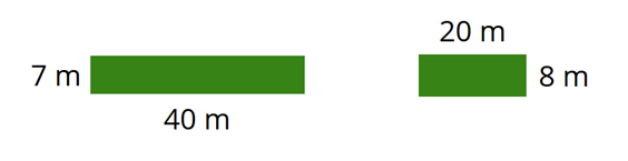 Podziel kształt trawnika na 2 prostokąty, opisz ich wymiary i oblicz ich pola powierzchni. Dodaj do siebie obliczone pola, by obliczyć całkowitą powierzchnię trawnika. By obliczyć ile kilogramów nasion potrzeba do obsiania trawnika, podziel powierzchnię trawnika przez 40.