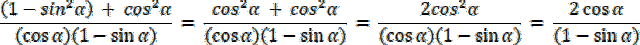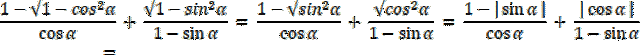 W tym zadaniu wyjdź z lewej strony równania, aby otrzymać prawą stronę. Przy rozwiązywaniu, skorzystaj z twierdzenia jedynki trygonometrycznej: sin2α + cos2α = 1, a dokładniej, z przekształceń: cos2α = 1–sin2α i sin2α = 1–cos2α. Dla α ⋲ (270°, 360°), sin α < 0 i cos α > 0, więc |sin α| = –sin α i |cos α| = cos α.