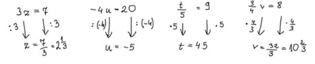 Wykonaj takie działania, by po lewej stronie została sama niewiadoma. Pierwsze równanie: podziel obie strony równania przez 3. Drugie równanie: podziel obie strony równania przez -4. Trzecie równanie: Pomnóż obie strony równania przez 5. Czwarte równanie: Pomnóż obie strony równania przez
