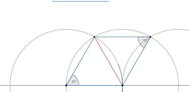 Zastanów się, skoro kąt ostry ma 60 stopni, to kąt rozwarty musi mieć miarę 180 – 60 = 120 stopni. Wszystkie cztery boki rombu mają taką samą długość, a przekątne dzielą czworokąt na połowy. Oznacza, to, że krótsza przekątna podzieli kąty rozwarte na dwa katy po 60 stopni, co da trójkąty o trzech kątach równych 60 stopni, czyli trójkąty równoboczne. Konstrukcję zacznij od odcinka na prostej. Następnie zatocz od jego końców łuki o takim samym promieniu, miejsce przecięcia się tych łuków to miejsce kolejnego wierzchołka. Łącząc go z obydwoma punktami, otrzymasz trójkąt równoboczny, a jak już wcześniej ustalaliśmy, jest to połowa rombu. Teraz możesz od jednego z boków trójkąta zakreślić takie same łuki, tworząc ostatni wierzchołek i drugi trójkąt równocześnie. Na koniec zaznacz, które odcinki to boki rombu, a który to jego przekątna (ta przekątna ma taką samą długość, co boki).