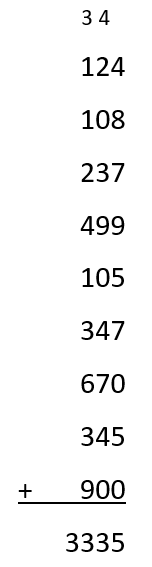 124 + 108 + 237 + 499 + 105 + 347 + 670 + 345 + 900 = 3335