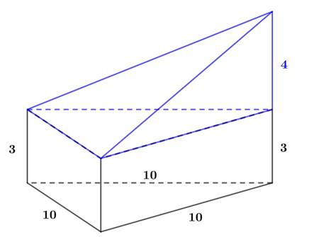 Można daną bryłę skleić z inną bryłą tak, aby utworzyły one razem graniastosłup przedstawiony na poniższym rysunku. Zaznacz doklejoną bryłę i oblicz szukaną objętość.