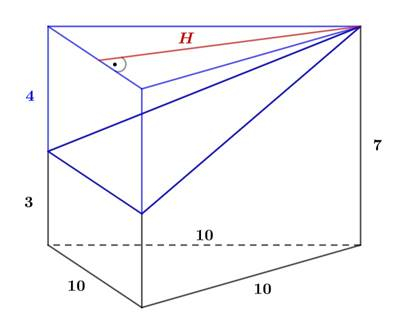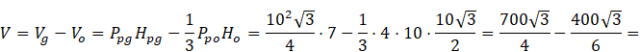 W metodzie drugiej graniastosłup ma w podstawie trójkąt równoboczny, natomiast ostrosłup w podstawie posiada prostokąt. Wysokością ostrosłupa (H) jest wysokość w trójkącie równobocznym. Objętość szukanej bryły oblicz jako ich różnicę.