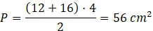 Zielona część paska ma kształt trapezu prostokątnego o długości podstaw 12 cm i 16 cm oraz wysokości 4 cm . Pole tej figury jest równe 56 cm2.