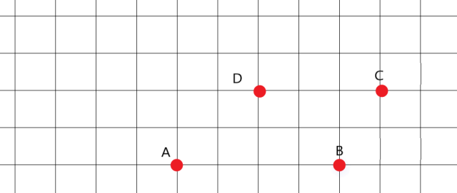 Punkty A, B i C, stanowią trzy wierzchołki trapezu ABCD, oblicz i zaznacz na rysku punkt D, jeśli pole tego trapezu wynosi 7, a punktami podstaw są punktu AB i CD.