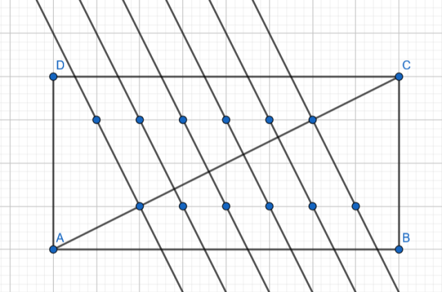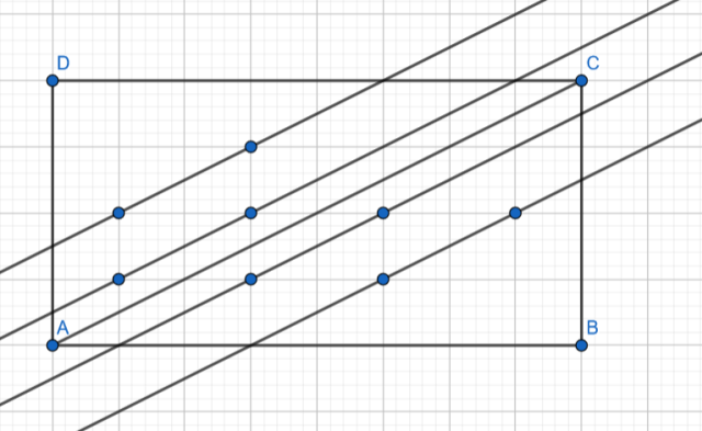 Możesz narysować 4 równoległe do przekątnej AC prostych, które mają końce w punktach kratowych tego prostokąta.