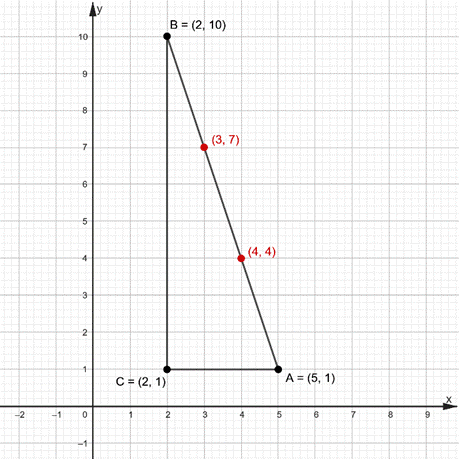 Punkt kratowy w układzie współrzędnych to taki punkt, którego współrzędne są liczbami całkowitymi. Odczytaj jakie liczby całkowite leżą między punktami A = (5, 1) i B = (2, 10) na osi x: x = 3 oraz x = 4