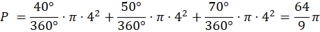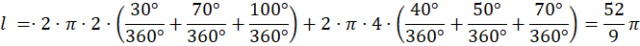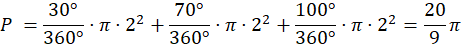 , gdzie α oznacza kąt zakreślony przez dany łuk, natomiast r oznacza promień danego łuku. Obwód danej figury oblicz sumując kolejne długości boków oraz łuków wykorzystując następujący wzór