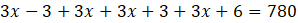 Sprawdź, czy są takie cztery kolejne liczby naturalne podzielne przez 3, które po zsumowaniu są równe 780.