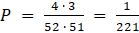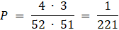 Asów w całej talii jest 4, prawdopodobieństwo to wynosi więc – najpierw mamy do wyboru 4 asy, a następnie 3, ponieważ jednego już wylosowaliśmy, całość dzielimy przez wszystkie możliwe losowania.