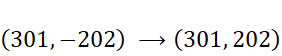 Podaj współrzędne punktu symetrycznego względem osi x do punktu (301, -202).