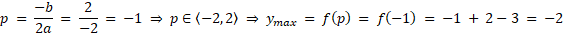 Określamy współczynnik a – jest ujemny, więc ramiona są skierowane w dół oraz p i sprawdzamy, czy należy on do przedziału. Tutaj należy, więc wartość największa jest przyjmowana dla argumentu p. Aby określić wartość najmniejszą obliczamy wartości funkcji dla skrajnych argumentów przedziału. Następnie obliczamy ich różnicę.