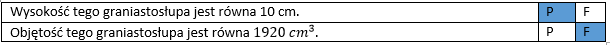 Oblicz długość krawędzi podstawy i zauważ, że pierwsze zdanie jest prawdziwe. Kolejno oblicz objętość graniastosłupa i zauważ, że drugie zdanie jest fałszywe.