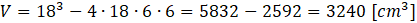Aby obliczyć objętość bryły od objętości sześcianu o krawędzi długości 18 cm, odejmij 4 razy objętość prostopadłościanu o wymiarach 18 cm x 6 cm x 6 cm.