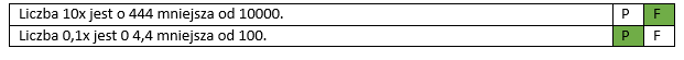 Liczba x jest o 44 mniejsza od tysiąca. Oceń prawdziwość podanych zdań. Wybierz P, jeśli zdanie jest prawdziwe, lub F – jeśli jest fałszywe.