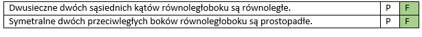 | Symetralne dwóch przeciwległych boków równoległoboku są prostopadłe. | P | F |