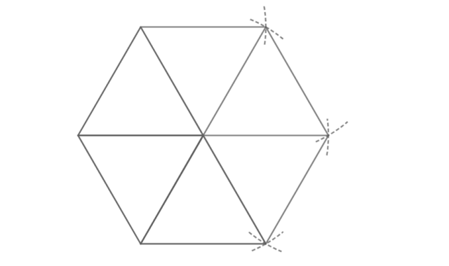 Na rysunku znajdują się już trzy trójkąty, czyli należy dorysować kolejne trzy trójkąty równoboczne. Aby powstał z nich sześciokąt foremny, muszą się one znaleźć po prawej stronie już namalowanych. Odmierz cyrklem długość jednego boku (wszystkie trójkąty są takie same) i zatocz łuki z dwóch końców boku trójkąta. Połącz ze sobą miejsce przecięcia i końce odcinka – otrzymasz trójkąt równoboczny. Powtórz te czynności, tym razem zataczając łuki od końców odcinka w nowopowstałym trójkącie. Ostatni trójkąt nie musi być wykonany konstrukcyjnie – dorysuj odcinek łączący wierzchołki dwóch trójkątów.