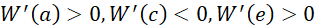 Pochodna funkcji mówi Ci o ekstremach lokalnych funkcji. Zauważ, że w punkcie b oraz d masz maksimum, oraz minimum lokalne. Oznacza to, że pochodna tej funkcji dla
