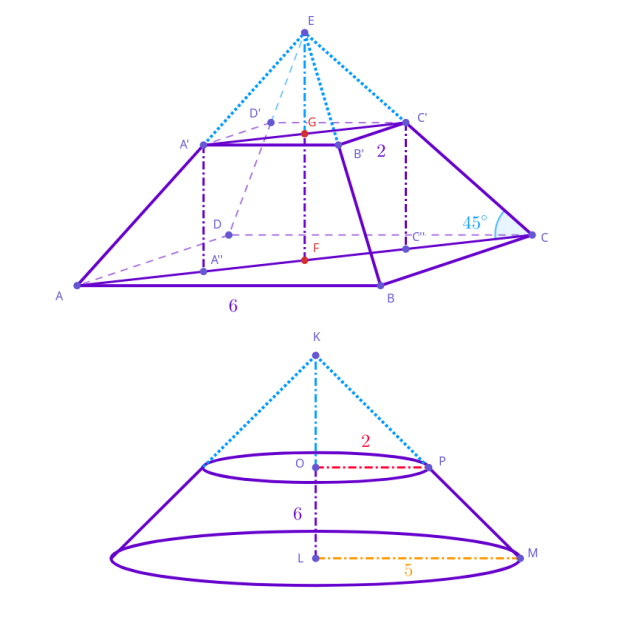 Objętość ostrosłupa ściętego to różnica objętości 𝐴𝐵𝐶𝐷𝐸 i 𝐴′𝐵′𝐶′𝐷′𝐸:
