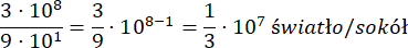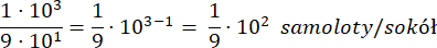 Na początku podziel prędkość samolotu przez prędkość sokoła - podziel również liczby zapisane w notacji wykładniczej: podziel pierwszy czynnik z jednej liczy przez pierwszy czynnik drugiej liczby. To samo zrób z drugimi czynnikami liczb – pamiętaj, że dzieląc potęgi o tych samych podstawach, musisz odjąć od siebie wykładniki, a podstawy pozostają bez zmian.