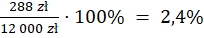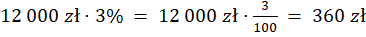 Oblicz najpierw kwotę odsetek wypłacaną przez bank (3% z 12 000 zł) w ciągu roku. Następnie wylicz kwotę podatku (20% z wyliczonych odsetek 360 zł) i odejmij ją od 360 zł – taką kwotę otrzyma klient. Na lokacie po roku znajdzie się początkowe 12 000 zł plus otrzymane odsetki w wysokości 288 zł. W ostatnim kroku policz, jaka jest rzeczywista stopa oprocentowania lokaty (po odliczeniu podatku), tzn. jaki procent z 12 000 zł stanowi uzyskane 288 zł.
