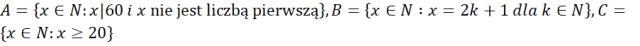 Zauważ, że zbiór A tworzą dzielniki liczby 60, które nie są liczbami pierwszymi – wypisz je. Zbiór B ma nieskończenie wiele elementów, ponieważ są to liczby nieparzyste. Więc zbiór B’, czyli jego dopełnienie, to liczby parzyste. Zbiór C ma także nieskończenie wiele elementów, ponieważ są to liczby większe lub równe 20. Więc jego dopełnienie, czyli zbiór C’, to liczby mniejsze od 20. Oznacza to, że zbiór
