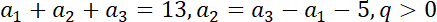 Podaj czwarty wyraz monotonicznego ciągu geometrycznego, jeżeli wiadomo, że suma jego początkowych trzech wyrazów jest równa 13. Natomiast drugi wyraz jest o 5 mniejszy od różnicy między trzecim wyrazem a pierwszym.