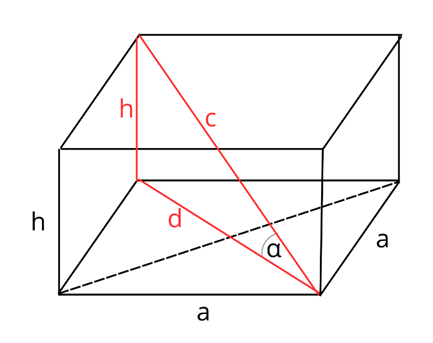 . Teraz obliczamy długość przekątnej graniastosłupa z twierdzenia Pitagorasa. Sinus nachylenia tej przekątnej do podstawy to iloraz wysokości graniastosłupa do przekątnej bryły.