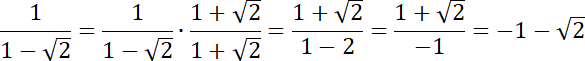 Zauważ, że musisz pozbyć się niewymierności z mianownika, czyli pomnożyć licznik i mianownik ułamka przez wartość znajdującą się w mianowniku, z przeciwnym znakiem pomiędzy wyrażeniami. W mianowniku możesz skorzystać ze wzoru skróconego mnożenia na różnicę kwadratów: