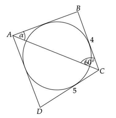 Oblicz obwód czworokąta opisanego na okręgu, w którym , przekątna tworzy z bokiem kąt o mierze , a z bokiem kąt ostry, którego sinus wynosi