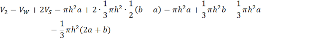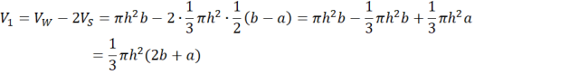 Wykonaj rysunki pomocnicze. Oblicz objętość każdej z brył jako sumę/różnicę objętości walca i dwóch stożków.