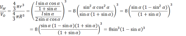 Skorzystaj z funkcji sinus w trójkącie zawierającym promień, wysokość i tworzącą stożka, aby wyznaczyć długość jego promienia. Następnie dwukrotnie skorzystaj ze wzoru na pole trójkąta z promień okręgu opisanego i wpisanego w niego. Z powstałych równań wyznacz długości szukanym promieni, a następnie stosunek objętości kul o takich promieniach.