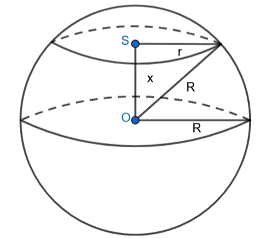 Wyznacz długość odcinka OS, jeśli wiadomo, że powierzchni kuli jest równe , a obwód przekroju jest równy , jeśli kulę o środku O przecięto płaszczyną i otrzymano w przekroju koło o środku S.
