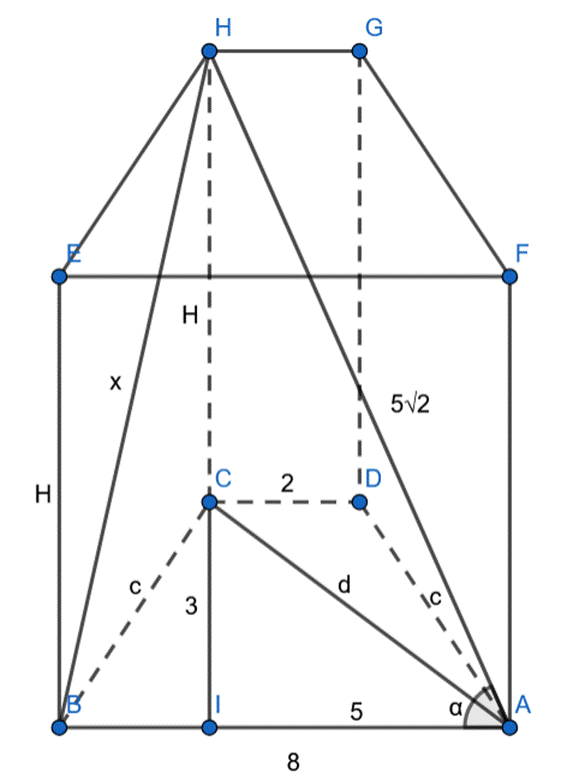 Wyznacz objętość graniastosłupa oraz miarę kąta między jego przekątną i najdłuższą krawędzią, jeżeli wiadomo, że ta przekątna ma długość oraz podstawą graniastosłupa prostego jest trapez równoramienny o podstawach długości 8 i 2 oraz wysokości równej 3.