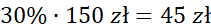 Oblicz, ile wynosi 30% ze 150 zł, a następnie ustal obecną cenę butów.