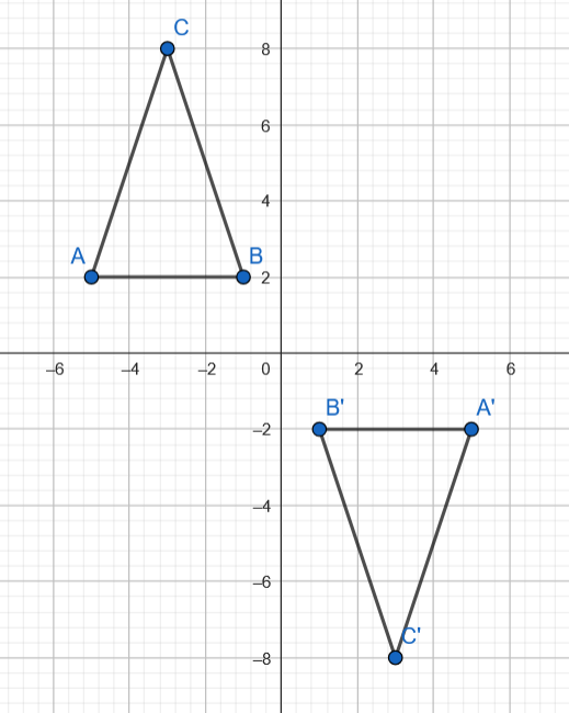 Ustal, czy figura będąca sumą trójkąta ABC i trójkąta A’B’C’ ma oś symetrii? Jeśli tak, to podaj jej równanie, jeśli punkty przekształcono przez symetrię względem początku układu współrzędnych i otrzymano odpowiednio punkty A’, B’, C’.