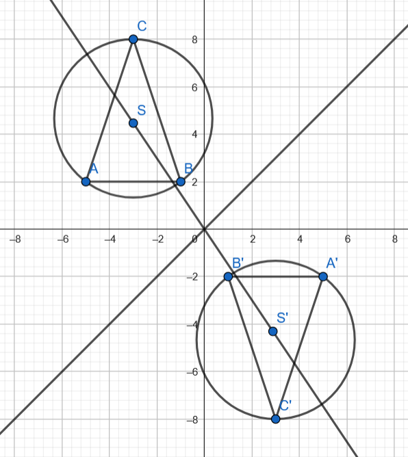 Czy figura będąca sumą okręgów opisanego na trójkącie ABC i opisanego na trójkącie A’B’C’ ma oś symetrii? Jeśli tak, to podaj jej równanie, jeśli punkty przekształcono przez symetrię względem początku układu współrzędnych i otrzymano odpowiednio punkty A’, B’, C’.