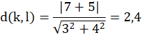 Należy wyznaczyć odległość między prostymi k:3x-4y+7 = 0 oraz l:3x-4y-5 = 0.