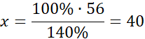 Wiedząc, że liczba 56 stanowi 140% z x, oblicz wartość liczby x.