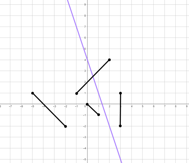Przekształć podaną prostą do postaci kierunkowej i narysuj jej wykres. Następnie, na tym samym wykresie zaznacz podane odcinki i zauważ, że prosta przecina się jedynie z prostą o końcach w punktach