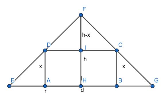 Skorzystaj z twierdzenia Pitagorasa i wyznacz przekątną prostokąta. Następnie zauważ, że trójkąty przedstawione na rysunku są podobne. Na tej podstawie zapisz stosunek długości ich krótszych podstaw oraz przeciwprostokątnych i na tej podstawie wyznacz długość i określ dziedzinę – wysokość i bok muszą być dodatnie. Następie oblicz jego objętość – zauważ, że powstanie funkcja zmiennej , oblicz jej pochodną i miejsce zerowe. Na koniec dla wyznaczonej długości boku wyznacz pozostałe wymiary prostopadłościanu.