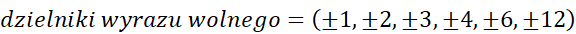 Sprawdzamy dzielniki wyrazu wolnego wielomianu, które mogą być pierwiastkami wielomianu, aż do skutku. Wielomian