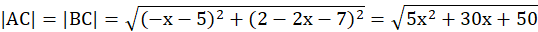 Należy wyznaczyć współrzędne punktów A i B leżących na prostej k: y = 2x + 7, aby były odległe o 5 od punktu C(-5,2).
