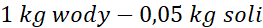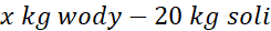 Ułóż odpowiednią proporcję, aby obliczyć ilu kilogramów wody potrzebujemy, aby uzyskać 20 kg soli.